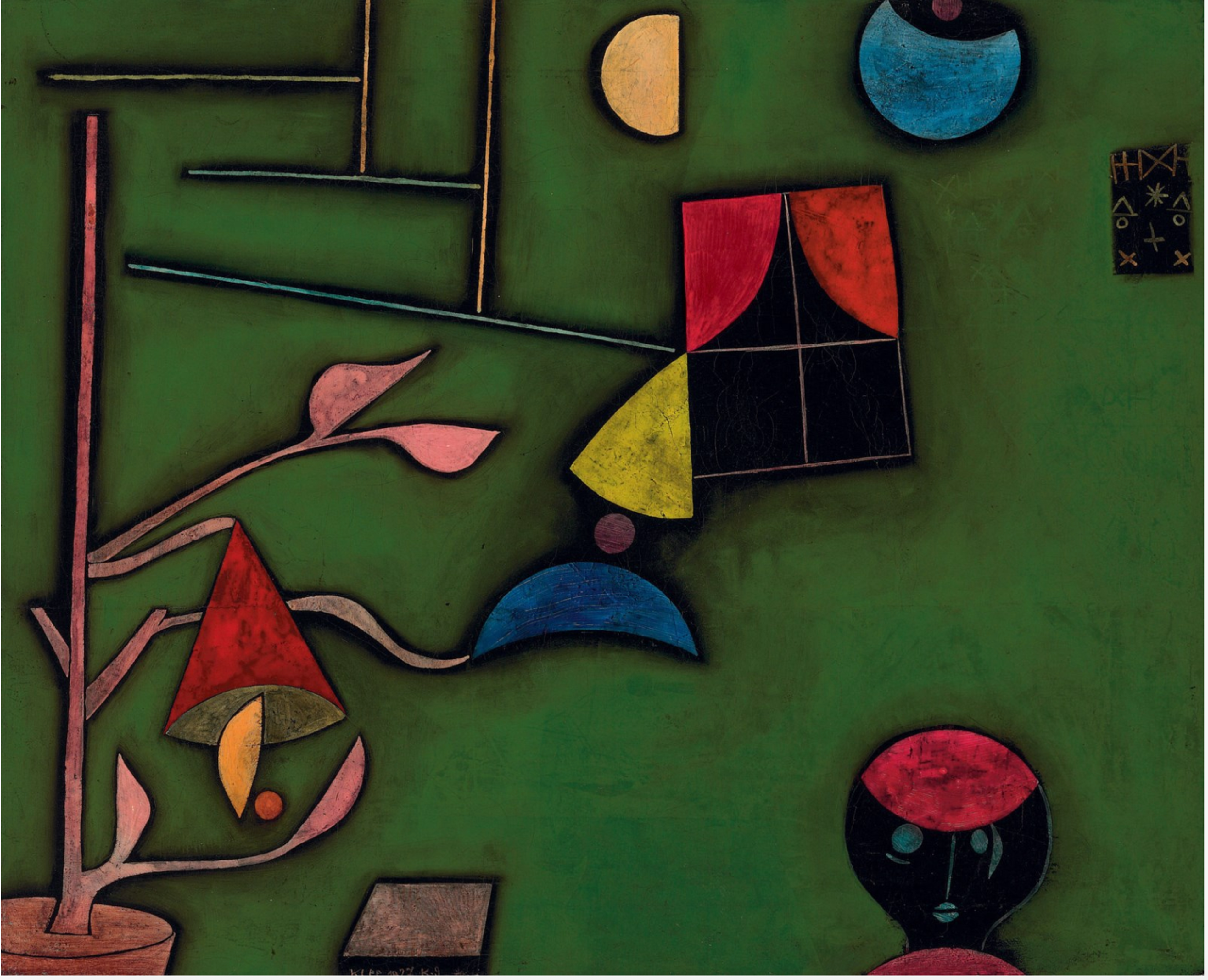 Pflanze Und Fenster Stilleben © Paul Klee 1927Pflanze Und Fenster Stilleben (1927), an aptly titled abstract still life featuring plants an a window, sold at Christie’s New York in November 2010. It was created at a pivotal time in Klee's career when the Bauhaus was forced to relocate from Weimar to Dessau. Despite its traditional-sounding title, this work is far from a conventional still life. The simple title suggests a traditional interior and still life composition, but the painting is characterised by distorted, two-dimensional imagery and diametric colour - what Klee once called "the irrational element in painting". The window motif, which appears in many of Klee's works, serves as a metaphorical boundary between interior and exterior, seen and unseen. The painting exemplifies Klee's mature Bauhaus style, in which he synthesised his theoretical explorations of colour and form with his instinctive sense of poetry and whimsy.