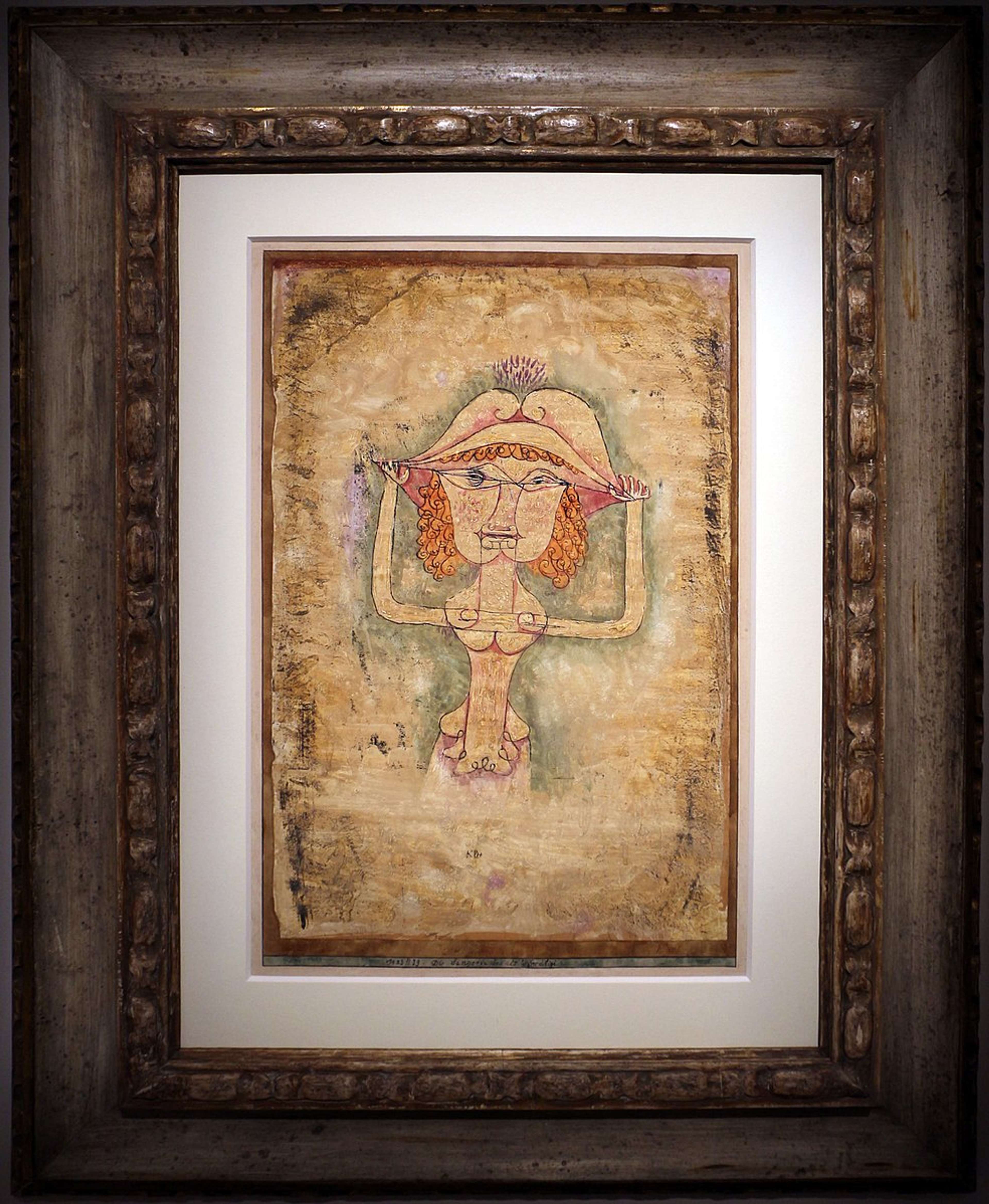 Die Sängerin L. Als Fiordiligi © Paul Klee 1923-39Die Sängerin L. Als Fiordiligi (1923-39), which was notably repeated in different media across a 16-year period, is Klee's most important opera painting and features one of the most frequently recurring motifs in his oeuvre. The work depicts a character from Mozart's comic opera Così Fan Tutte, Fiordiligi - one of the two main female protagonists. The scene referenced is Act 2, Scene 12, where Fiordiligi, having resisted Ferrando's advances, puts on her lover Guglielmo's helmet and declares her intention to fight alongside him. Klee created no less than five versions of this portrait, beginning with a needle-etched drawing that served as a prototype. The version sold at Sotheby's London in November 1989 is considered the main work of the series, which Klee elaborated into chalk, oil, and watercolour work. The initial creation of this work coincided with Klee joining the group Die Blaue Vier (The Blue Four) with Kandinsky, Lyonel Feininger, and Alexej von Jawlensky. The group was formed in 1923, and they lectured and exhibited together in the US in 1925. This painting became particularly popular among French Surrealists of the time, who appreciated its dreamlike quality and psychological complexity.